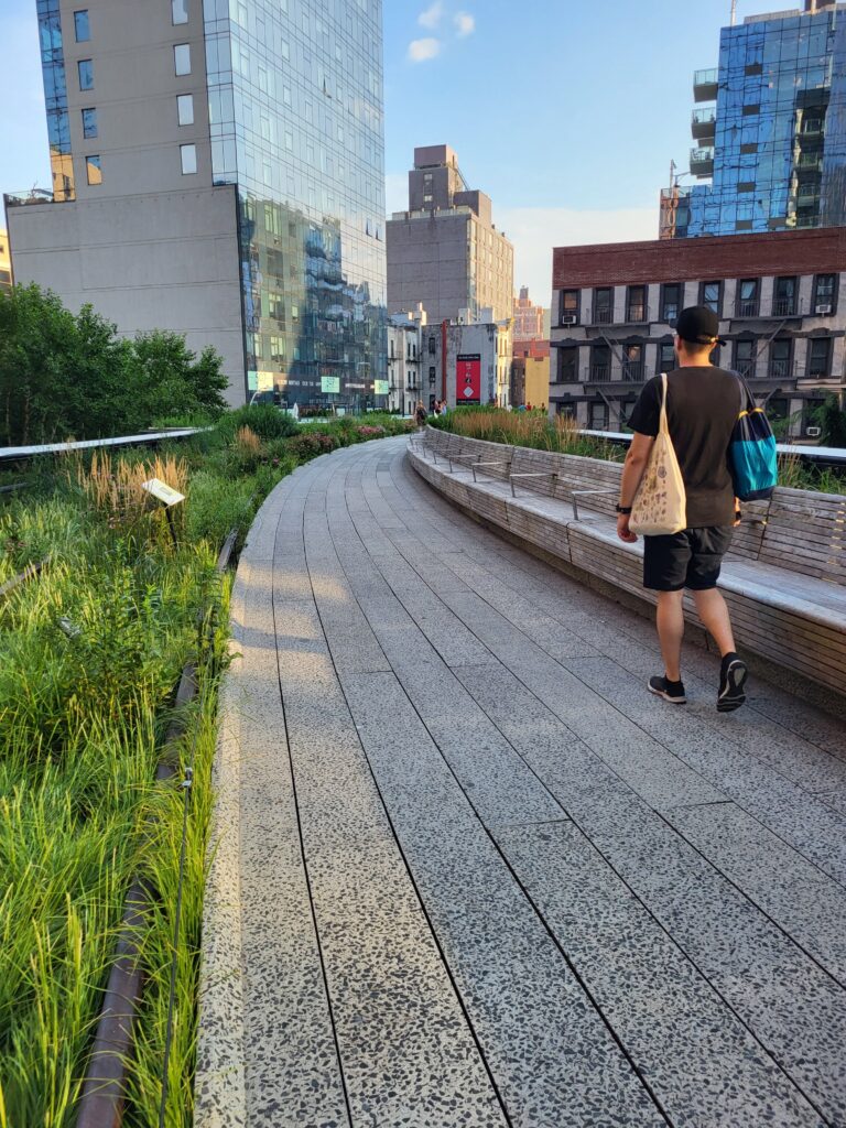 Gestartet haben wir ganz am Anfang der „High Line“ (für Touristen anscheinend unüblich, weil wir die ersten Meter sehr einsam spazierten). Die Highline ist eine alte Güterzugtrasse, welche vor ca. 20 Jahren zu einer Parkanlage umgebaut wurde und geht mitten durch Chelsea entlang des Hudson Rivers.