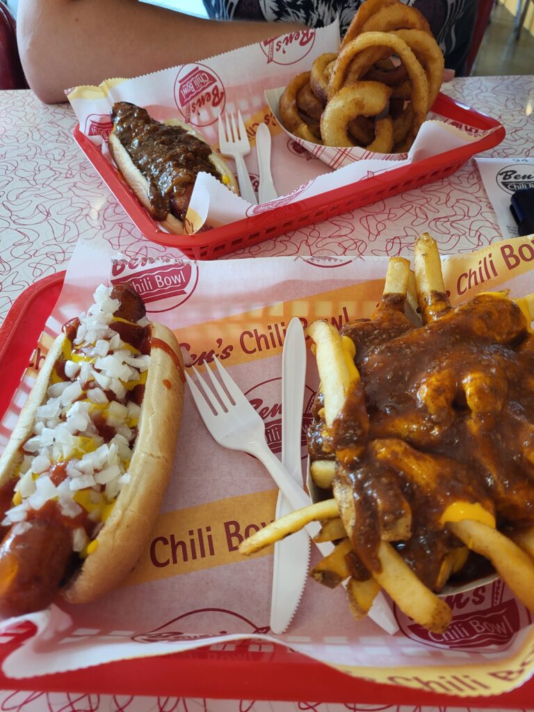 Zum Abschluss gönnten wir uns in dem für Washington berühmten Lokal „Bens Chilli Bowl“ Hot Dogs mit Chili (das sind Hot Dogs mit Chili con Carne drauf).
