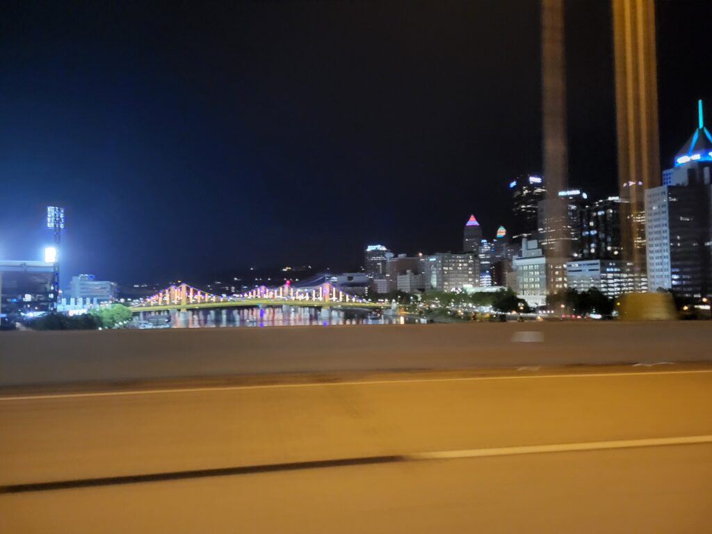 Nach viel auf und ab fuhren wir durch Fort Pitt Tunnel und wurden von dem Anblick der beleuchteten Skyline der Stadt überwältigt. Leider waren wir darauf nicht vorbereitet und ihr müsst uns einfach glauben – es war wahnsinnig schön!