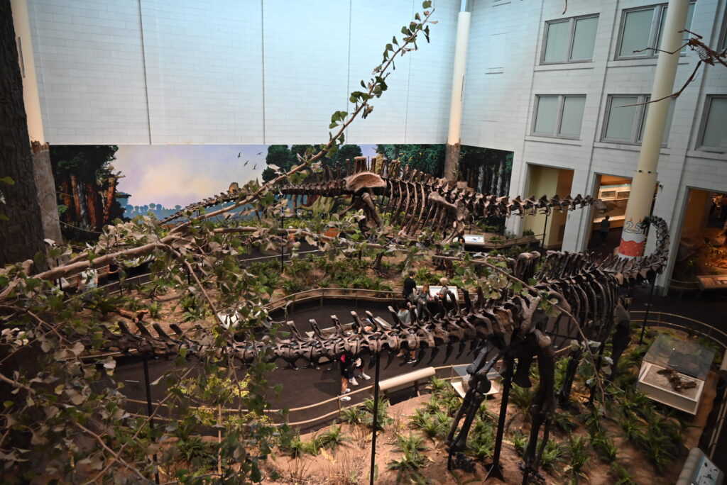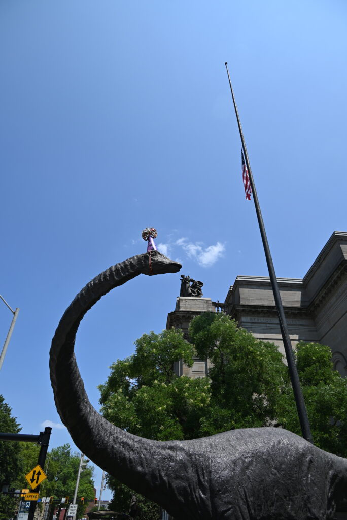 Vor dem Museum befindet sich „Dippy“ der Diplodocus, welcher sich anscheinend heute in Feierlaune befand (man siehe den Hut). An dieser Stelle fragten wir uns, ob jemand dafür den Dino hochklettern würde oder doch lieber die Leiter verwendet.
